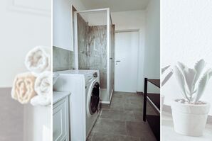Die Ausstattung des Apartments umfasst ein gemütlichen Wohnzimmer mit einem großen Esstisch für gemütliche Abende, einen Flachbild-TV, sowie einen Internetzugang via WLAN. Die Küche ist mit einer Kaffeemaschine (Filter), einem Toaster, einem Wasserkocher und einer Spülmaschine ausgestattet. Für längere Aufenthalte befinden sich auch ein Trockner und eine Waschmaschine in der Ferienunterkunft.
